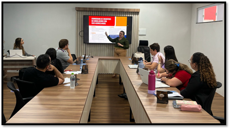 Durante a atividade, os docentes participaram de momentos de diálogo e reflexão sobre o Regulamento do Aconselhamento, aprofundando a compreensão acerca das atribuições do professor conselheiro como um importante agente de apoio acadêmico, emocional e social dos estudantes. A palestrante destacou práticas e estratégias voltadas ao acolhimento, à gestão do tempo e ao suporte emocional, ressaltando a importância da escuta qualificada e do acompanhamento individualizado no percurso acadêmico.